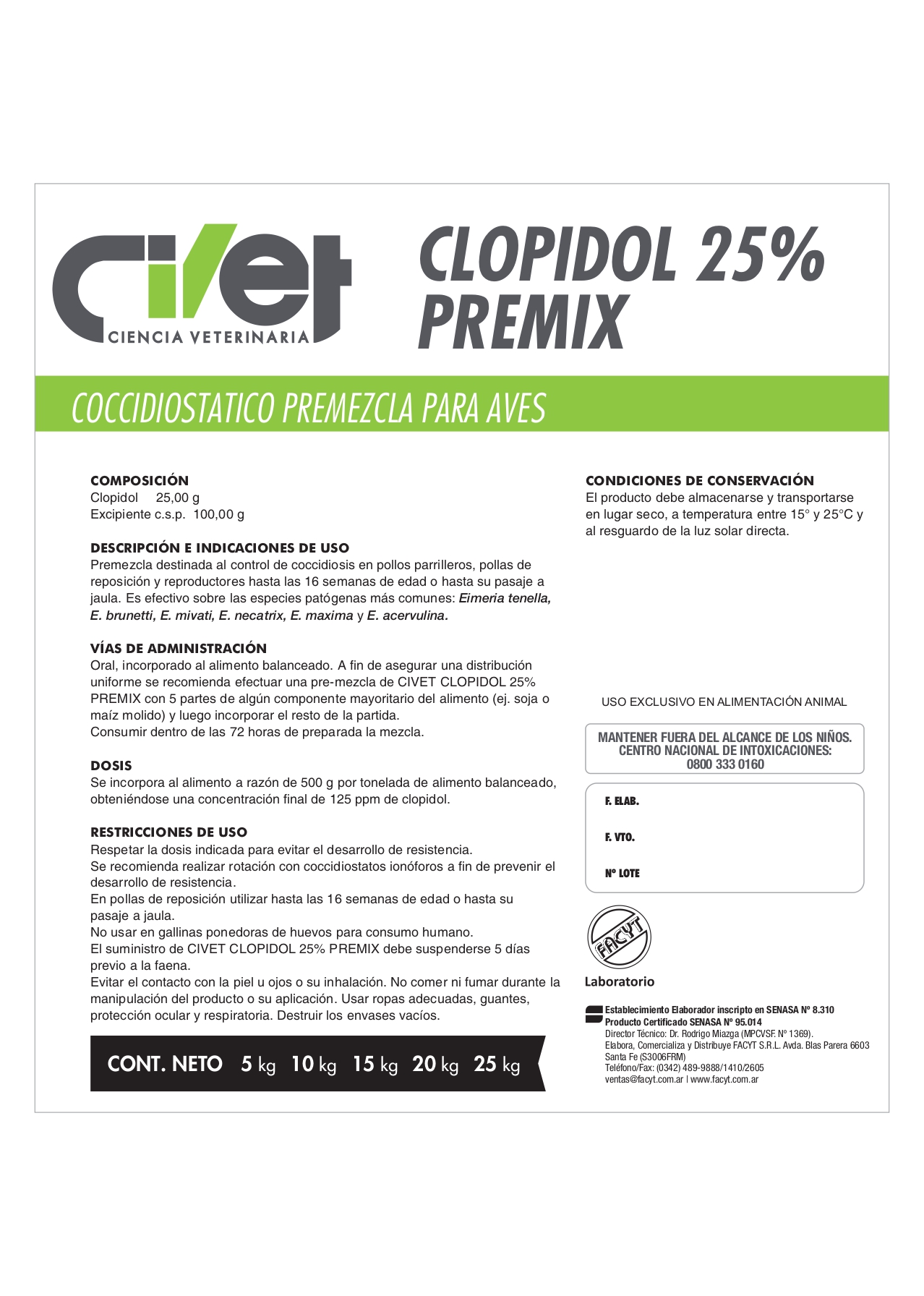 - El suministro de CIVET CLOPIDOL 25% PREMIX debe suspenderse 5 días previo a la faena.
