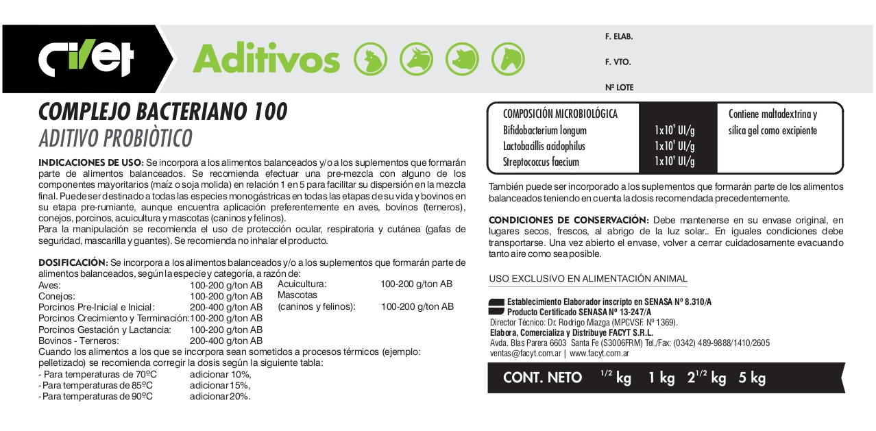 También puede ser incorporado a los suplementos que formarán parte de los alimentos balanceados teniendo en cuenta la dosis recomendada precedentemente.