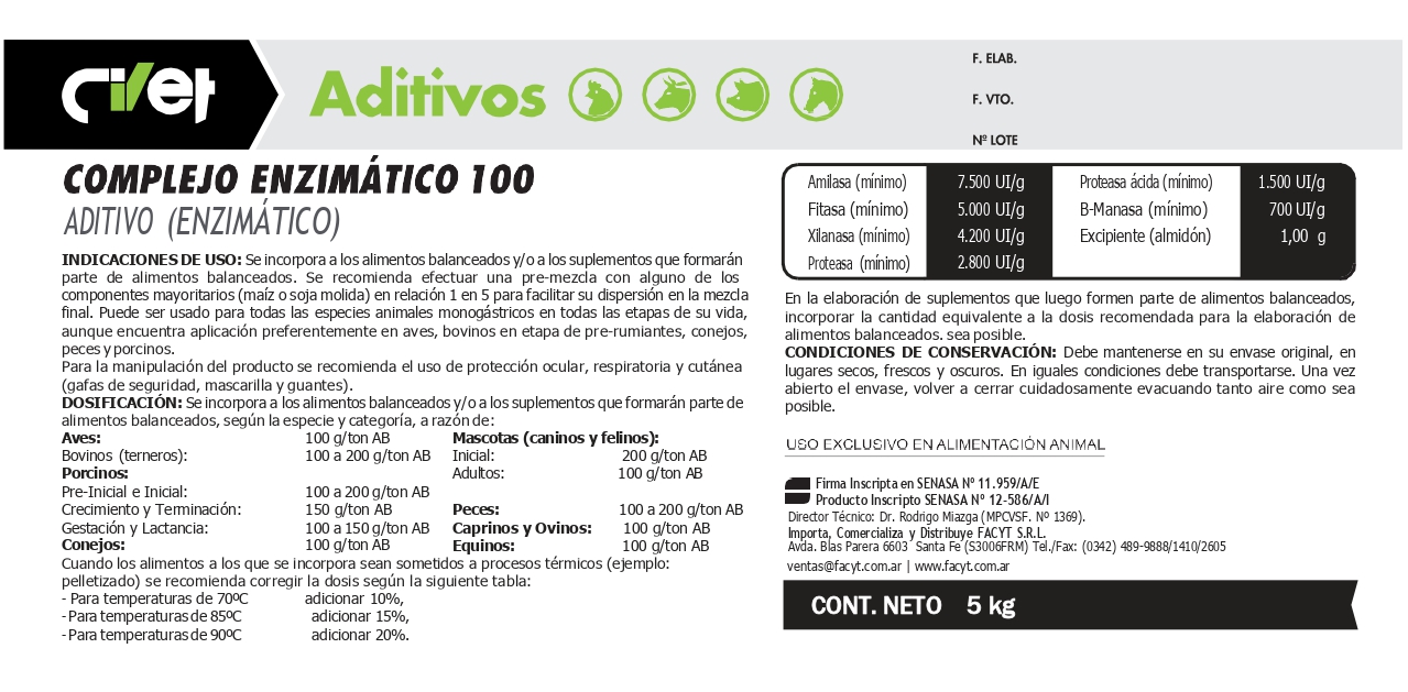 Puede ser usado para todas las especies animales monogástricos en todas las etapas de su vida, aunque encuentra aplicación preferentemente en aves, bovinos en etapa de pre-rumiantes, conejos, peces y porcinos.