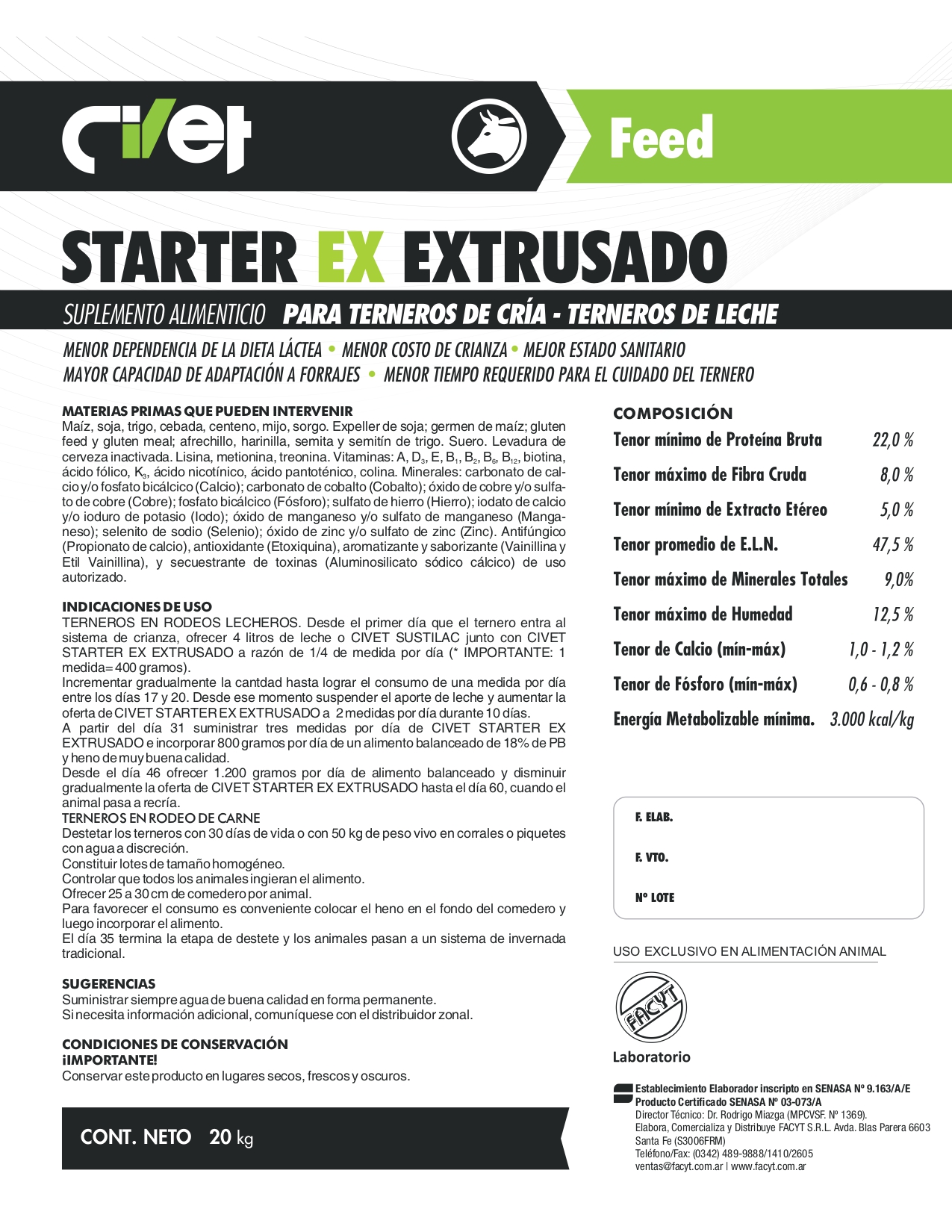 - Desde el primer día que ei ternero entra al sistema de crianza, ofrecer 4 litros de leche o CIVET SUSTILAC junto con CIVET STARTER EX EXTRUSADO a razón de 1/4 de medida por día IMPORTANTE: 1 medida= 400 gramos).