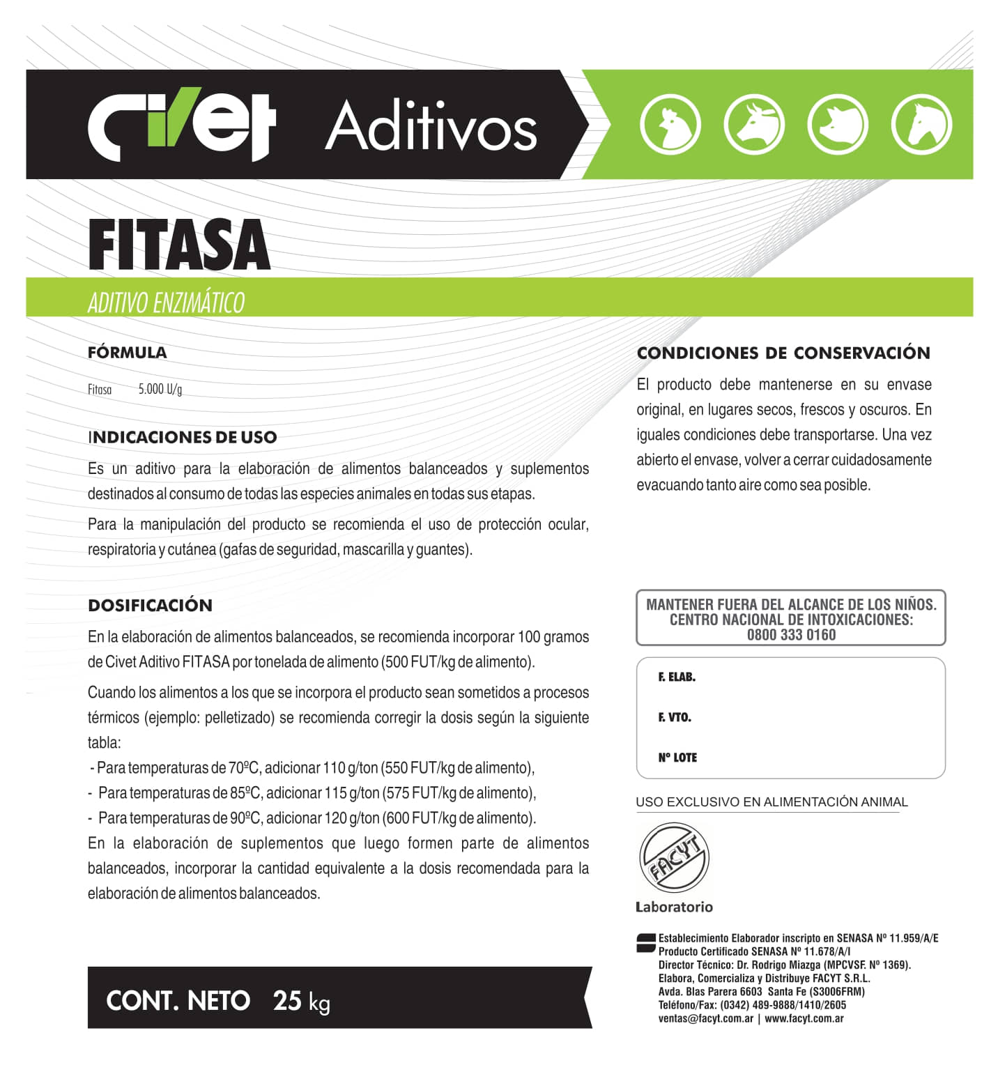 En la elaboración de alimentos balanceados, se recomienda incorporar 100 gramos de Civet Aditivo FITASA por tonelada de alimento (500 FUT/kg de alimento).