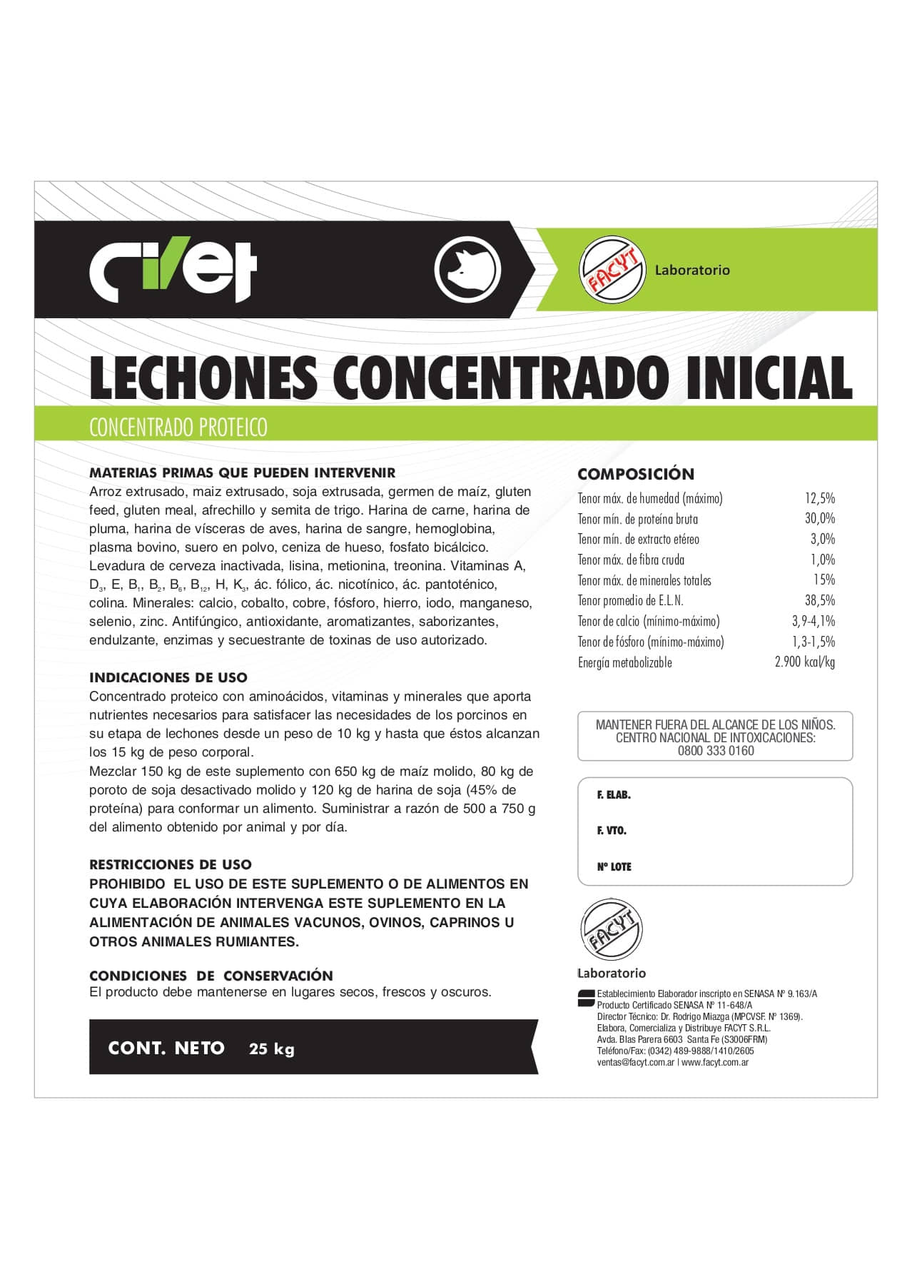 Concentrado proteico con aminoácidos, vitaminas y minerales que aporta nutrientes necesarios para satisfacer las necesidades de los porcinos en su etapa de lechones desde un peso de 10 kg y hasta que éstos alcanzan los 15 kg de peso corporal.