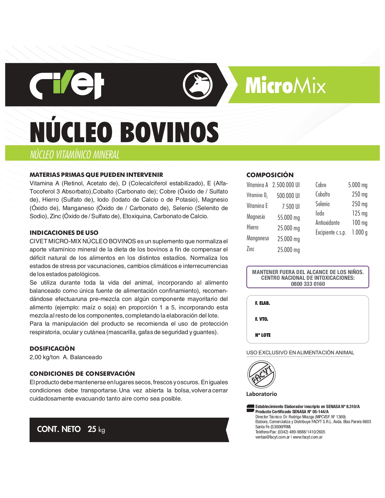 CIVET MICRO-MIX NÚCLEO BOVINOS es un suplemento que normaliza el aporte vitamínico mineral de la dieta de los bovinos a fin de compensar el déficit natural de los alimentos en los distintos estadíos. Normaliza los estados de stress por vacunaciones, cambios climáticos e interrecurrencias de los estados patológicos.