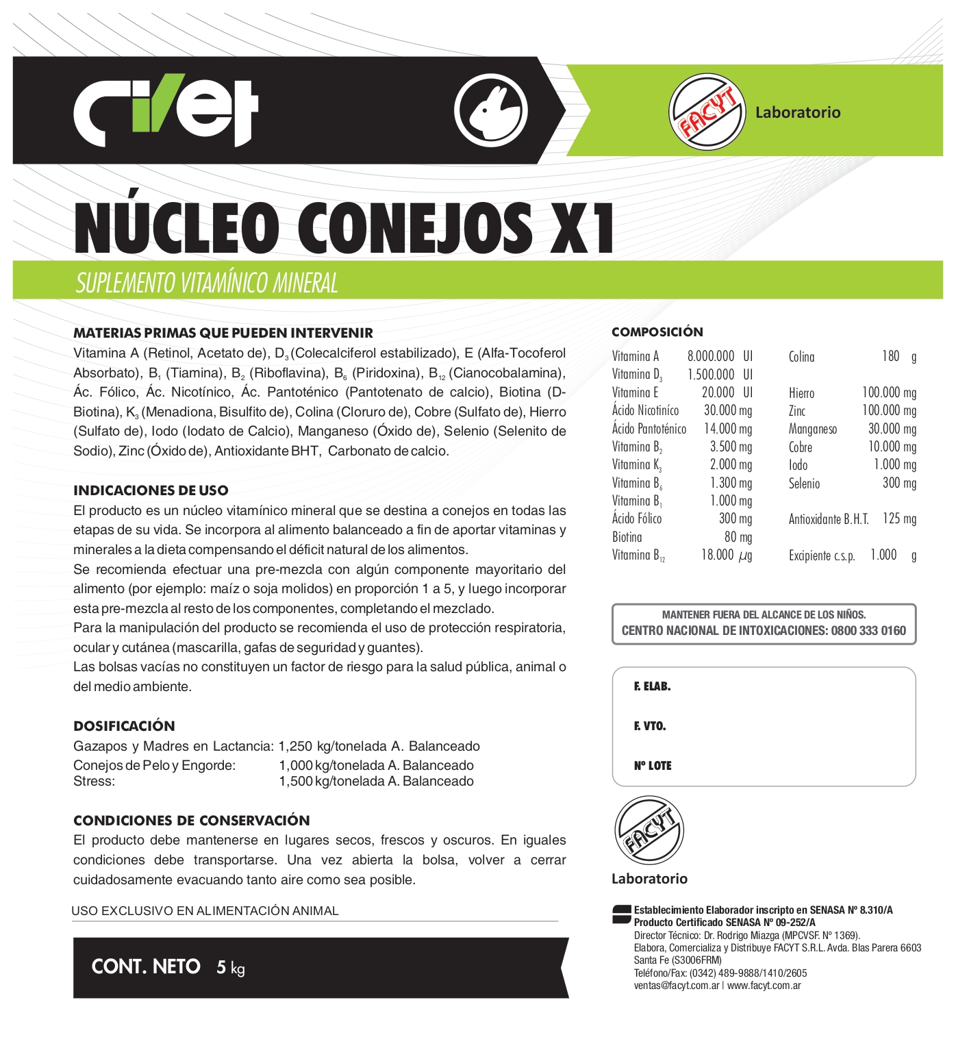 El producto es un núcleo vitamínico mineral que se destina a conejos en todas las etapas de su vida. Se incorpora al alimento balanceado a fin de aportar vitaminas y minerales a la dieta compensando el déficit natural de los alimentos.