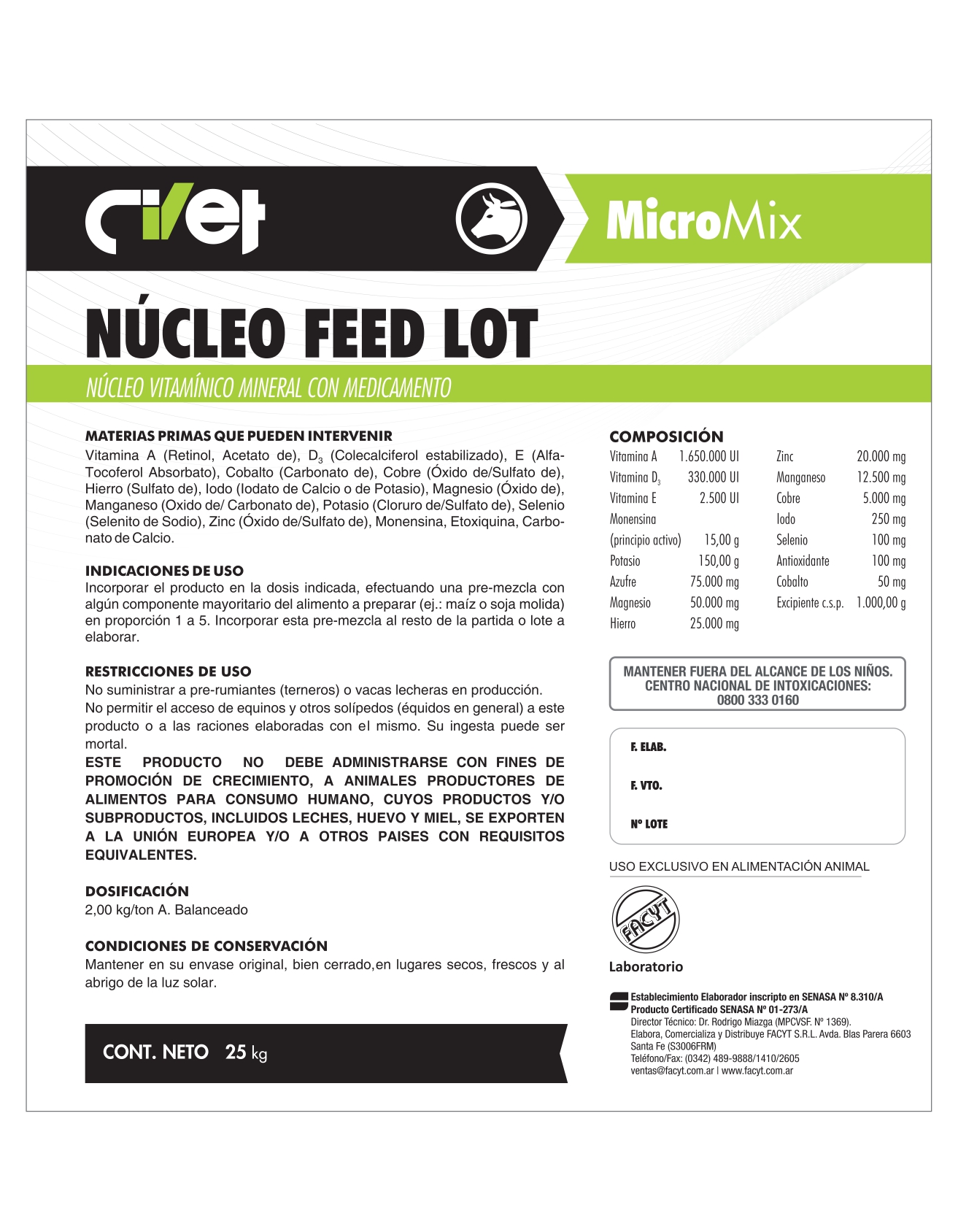 Vitamina A (Retinol, Acetato de), D3 (Colecalciferol estabilizado), E (AlfaTocoferol Absorbato), Cobalto (Carbonato de), Cobre (óxido de/Sulfato de), Hierro (Sulfato de), lodo (lodato de Calcio o de Potasio), Magnesio (óxido de), Manganeso (Oxido de/ Carbonato de), Potasio (Cloruro de/Sulfato de), Selenio (Selenito de Sodio), Zinc (óxido de/Sulfato de), Monensina, Etoxiquina, Carbonato de Calcio.