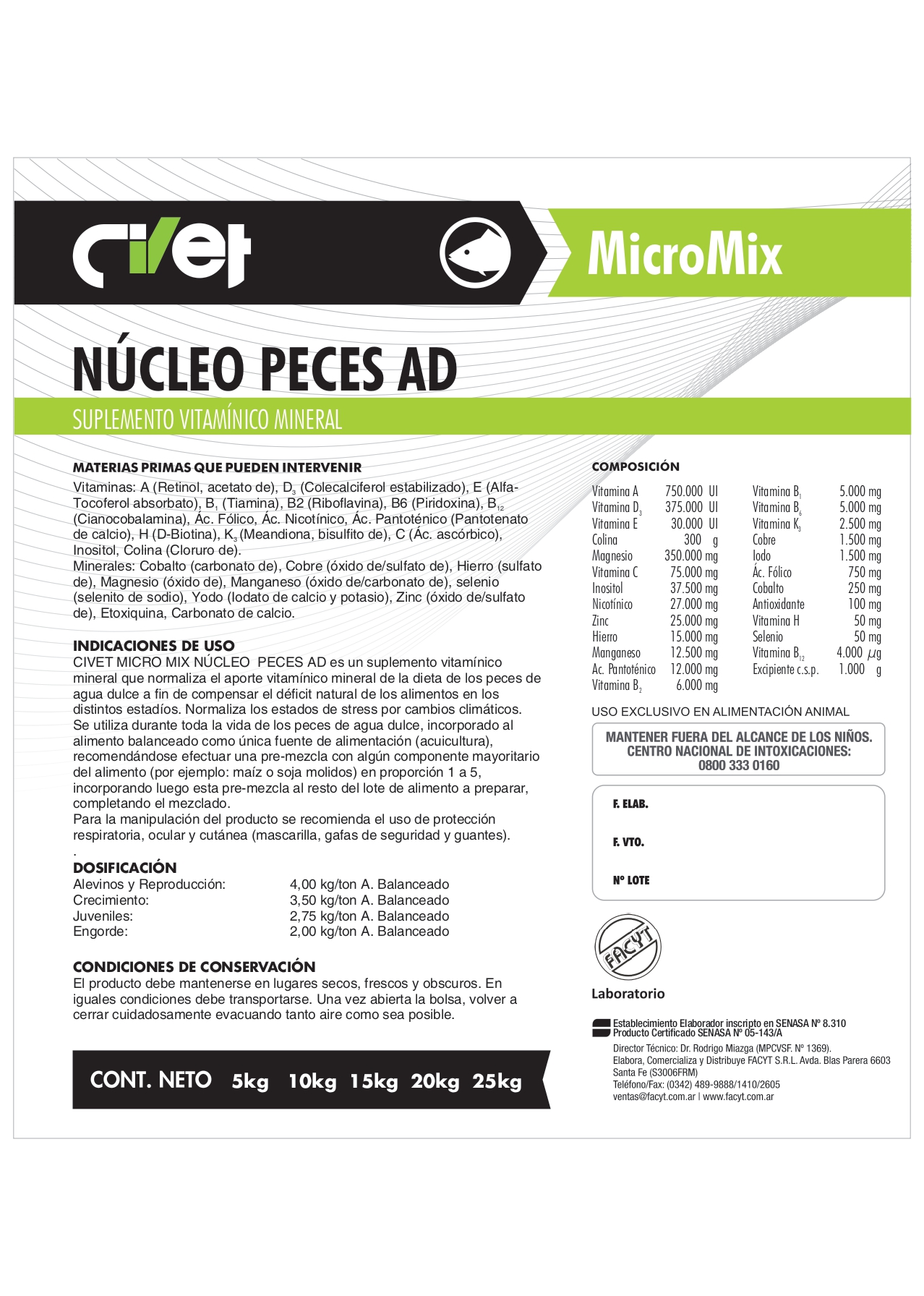 CIVET MICRO MIX NUCLEO PECES AD es un suplemento vitamínico mineral que normaliza el aporte vitamínico mineral de la dieta de los peces de agua dulce a fin de compensar el déficit natural de los alimentos en los distintos estadíos.