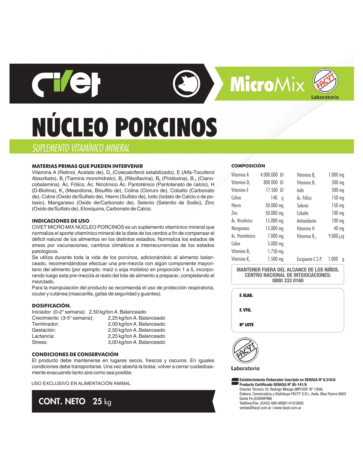 CIVET MICRO MIX NÚCLEO PORCINOS es un suplemento vitamínico mineral que normaliza el aporte vitamínico mineral de la dieta de los cerdos a fin de compensar el déficit natural de los alimentos en los distintos estadios.