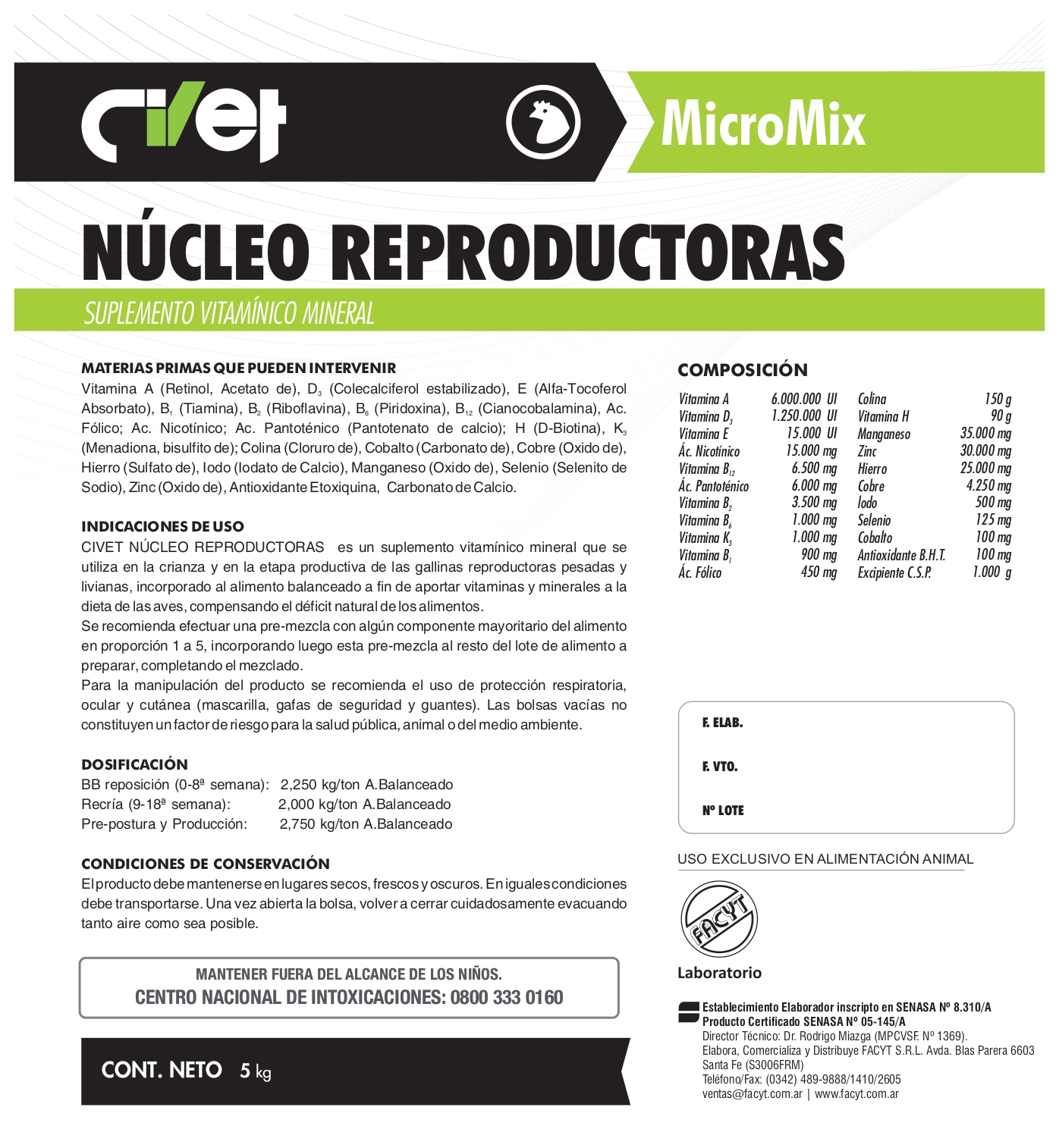 Vitamina A (Retinol, Acetato de), D3 (Colecalciferol estabilizado), E (Alfa-Tocoferol Absorbato), B1 (Tiamina), B2 (Riboflavina), B6 (Piridoxina), B12 (Cianocobalamina), Ac. Fólico; Ac. Nicotínico; Ac. Pantoténico (Pantotenato de calcio); H (D-Biotina), K3 (Menadiona, bisulfito de); Colina (Cloruro de), Cobalto (Carbonato de), Cobre (Oxido o Sulfato de), Hierro (Sulfato de), lodo (lodato de Calcio), Manganeso (Oxido de), Selenio (Selenito de Sodio), Zinc (Oxido de), Antioxidante Etoxiquina, Carbonato de Calcio.