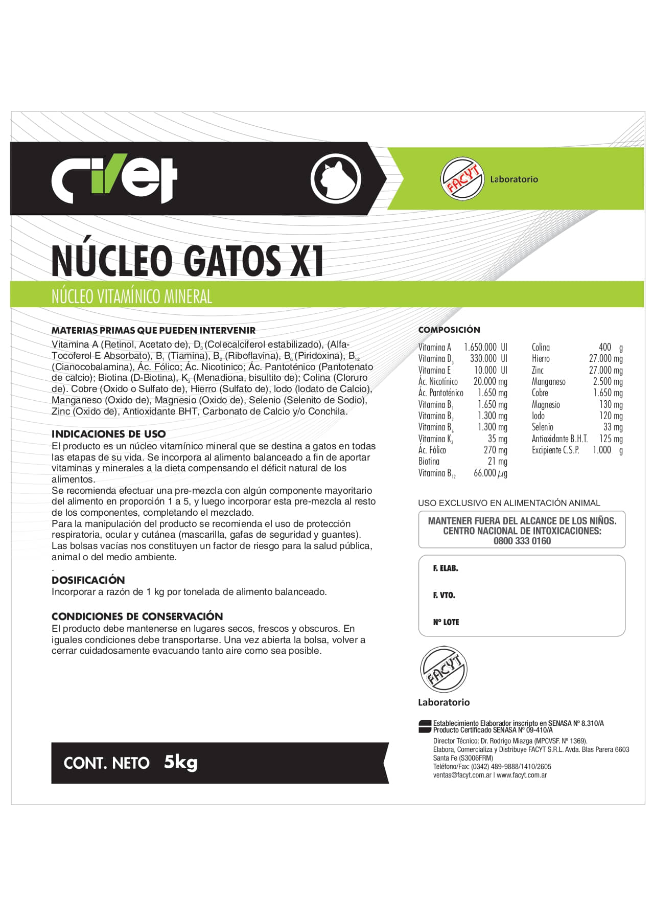 El producto es un núcleo vitamínico mineral que se destina a gatos en todas las etapas de su vida. Se incorpora al alimento balanceado a fin de aportar vitaminas y minerales a la dieta compensando el déficit natural de los alimentos.
