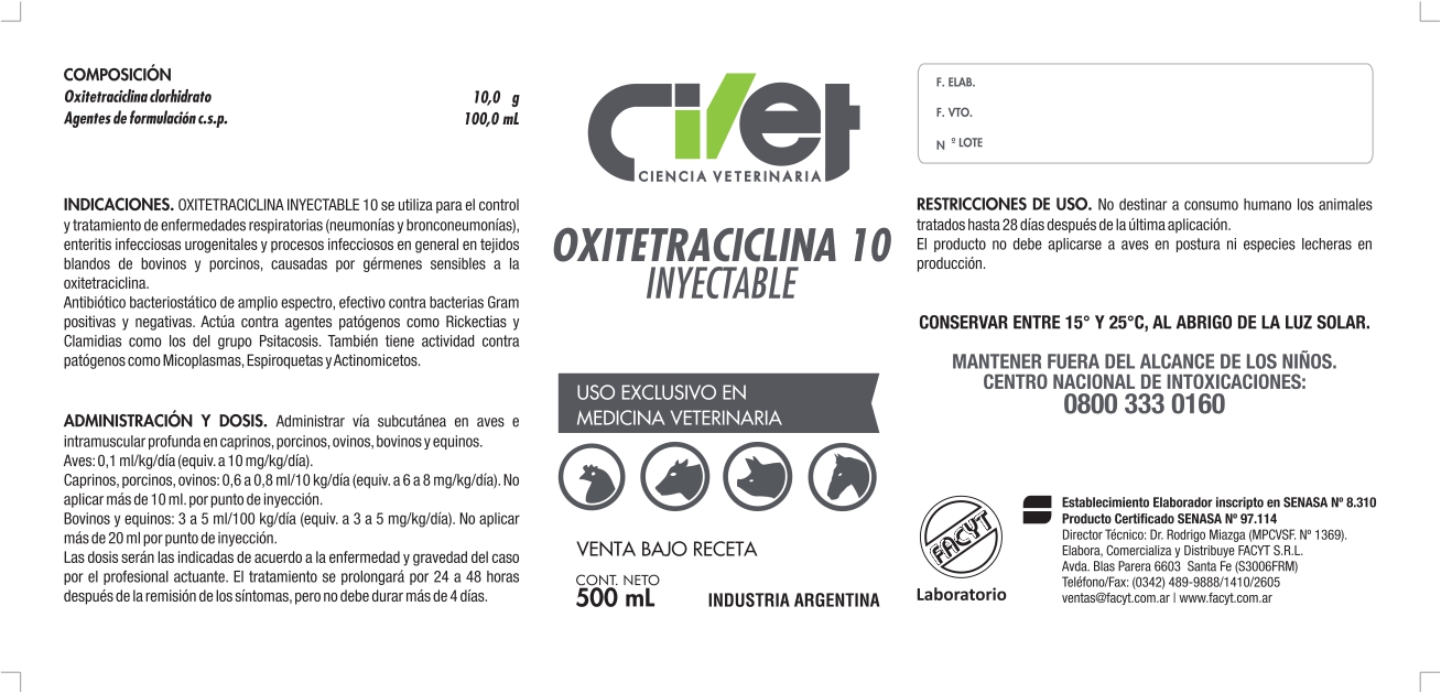 OXITETRACICLINA INYECTABLE 10 se utiliza para el control y tratamiento de enfermedades respiratorias (neumonías y bronconeumonías), enteritis infecciosas urogenitales y procesos infecciosos en general en tejidos blandos de bovinos y porcinos, causadas por gérmenes sensibles a la oxitetraciclina.