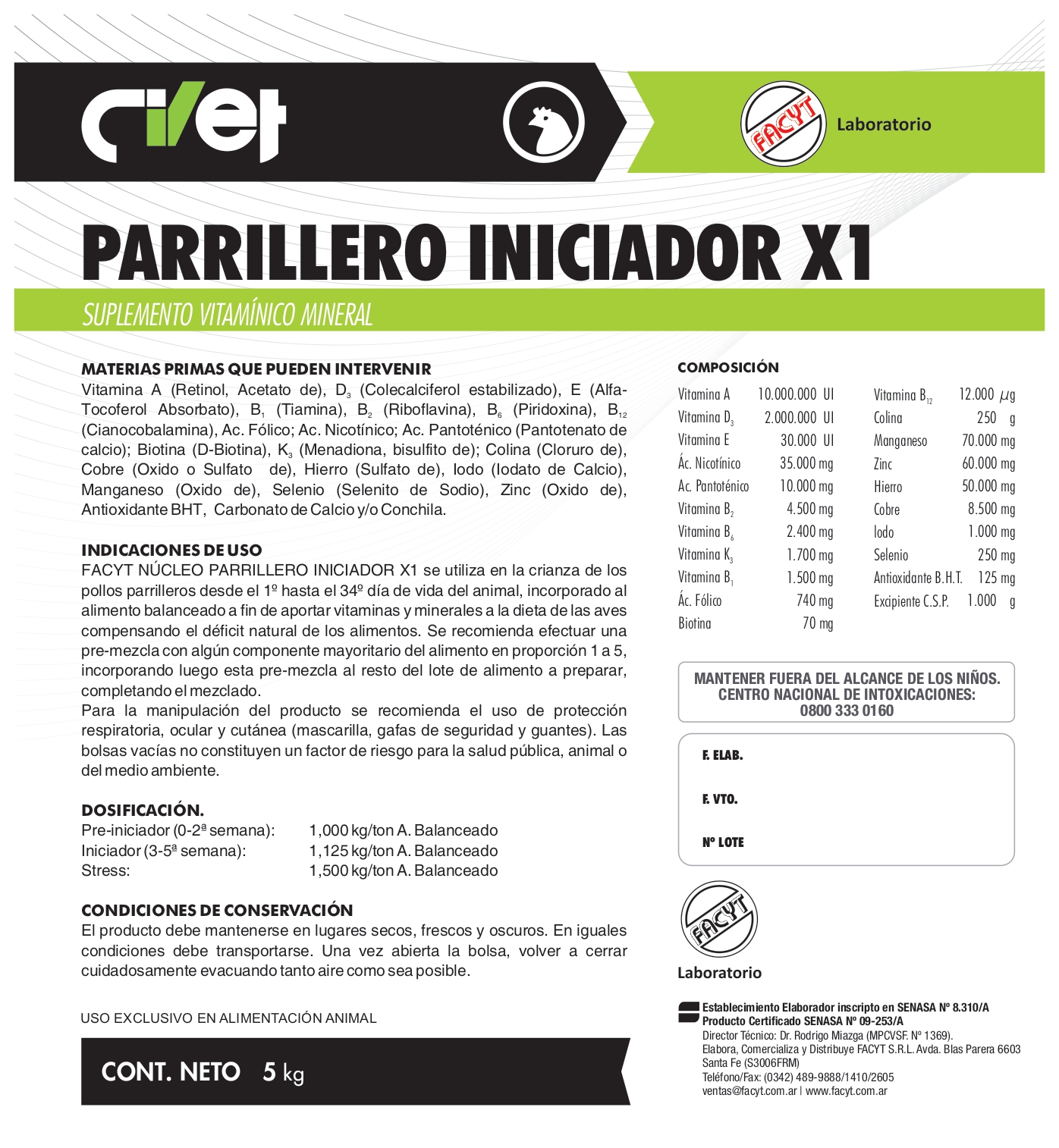 FACYT NÚCLEO PARRILLERO INICIADOR XI se utiliza en la crianza de los pollos parrilleros desde el 1 hasta el 34Q día de vida del animal, incorporado al alimento balanceado a fin de aportar vitaminas y minerales a la dieta de las aves compensando el déficit natural de los alimentos. Se recomienda efectuar una pre-mezcla con algún componente mayoritario del alimento en proporción 1 a 5, incorporando luego esta pre-mezcla al resto del lote de alimento a preparar,completando el mezclado.
