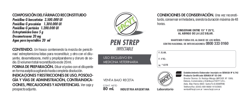 Un frasco conteniendo la mezcla de penicilinas/estreptomicina listas para reconstituir, y otro con el diluyente, dexametasona, metil y propilparabeno y cloruro de sodio.