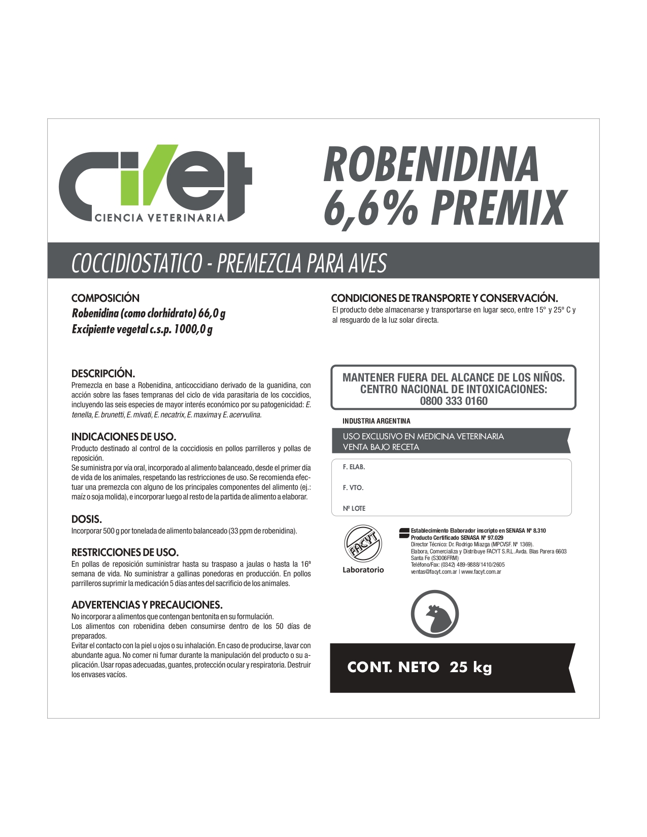 Premezcla en base a Robenidina, anticoccidiano derivado de la guanidina, con acción sobre las fases tempranas del ciclo de vida parasitaria de los coccidios, incluyendo las seis especies de mayor interés económico por su patogenicidad: E. tenella, E. brunetti, E. mivati, E. necatrix, E. maximay E. acervulina.