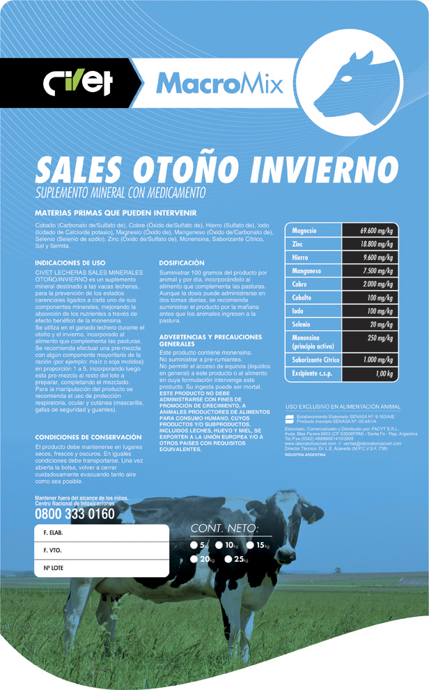 CIVET LECHERAS SALES MINERALES OTOÑO/INVIERNO es un suplemento mineral destinado a las vacas lecheras, para la prevencion de los estados carenciales ligados a cada uno de sus componentes minerales, mejorando la absorción de los nutrientes a través de efecto benéfico de la monensina.